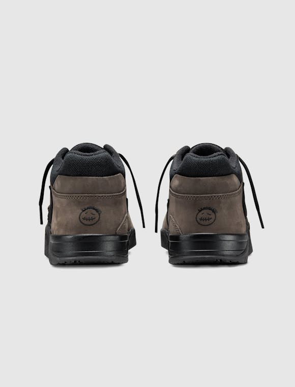 High top sneakers. Synthetic mesh upper. Suede overlays around the toe, eyelet panels, forefoot, and heel counter. Suede strap at the forefoot with a velcro closure. Suede logo motif shaped patches stitched on the side panels. Front lacing. Suede tongue with an embroidered logo motif at the center. Composite foam midsole. Rubber outsole.